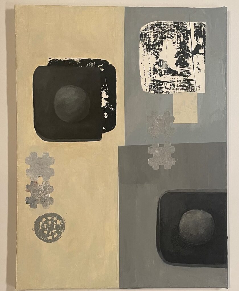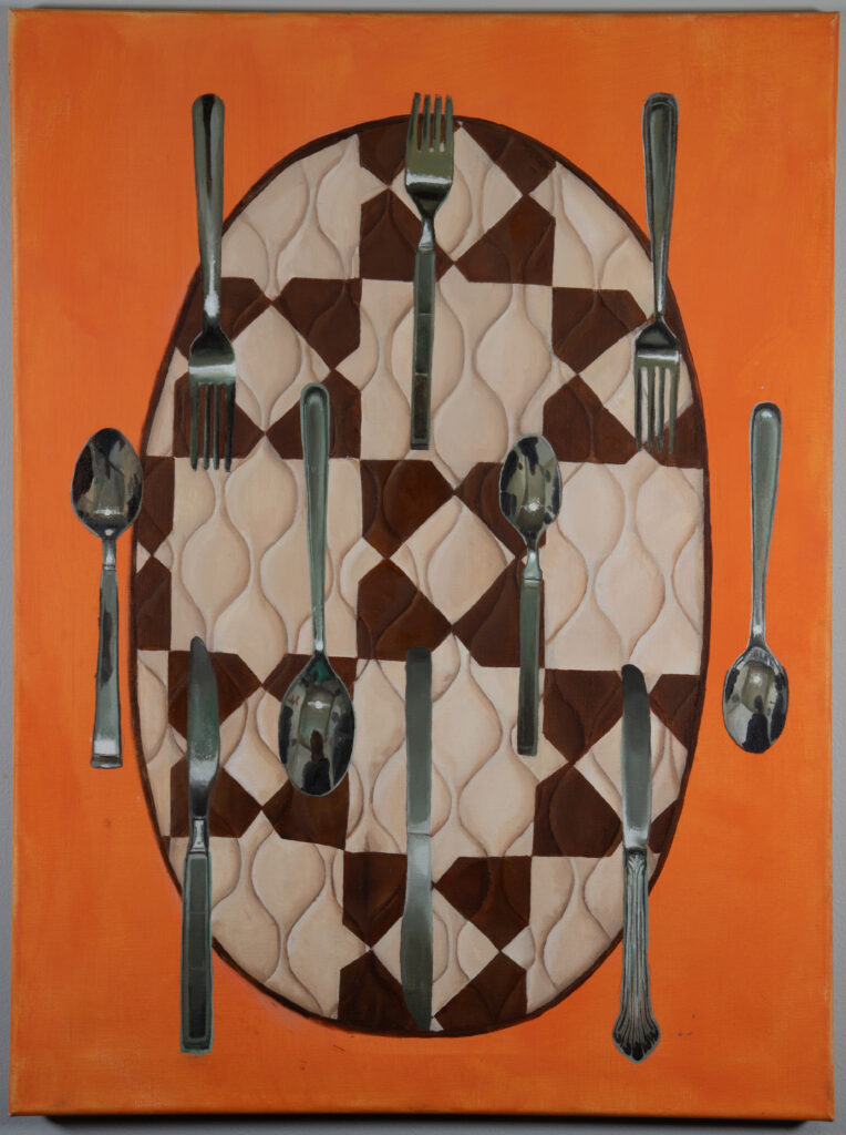 “Silverware” explores the descent of art forms into decoration as they pass through generations, eventually relegated to the peripheries of daily life. They are repurposed and combined through forgotten pasts. The subject is a placemat from my parents’ house that is a repurposed section of quilt probably made by a distant relative of mine (unknown to me) and the assortment of cutlery in my apartment, pooled by my roommates and ranging in embellishment level.