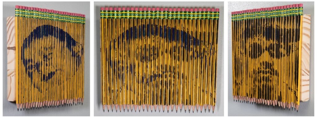 “Ambidextrous” is a lenticular combination of two headshot self portraits that are completed when viewed from the extreme right and left angles. The title refers to my lifelong confusion over whether I can consider myself ambidextrous for drawing with my left hand while throwing with my right. It is also a reflection to how objects change representation as one ages; the type of pencils themselves becoming an icon for schooling as I’ve graduated to using drawing pencils, and as my practice itself has shifted through phases of drawing, painting, and sculpture.