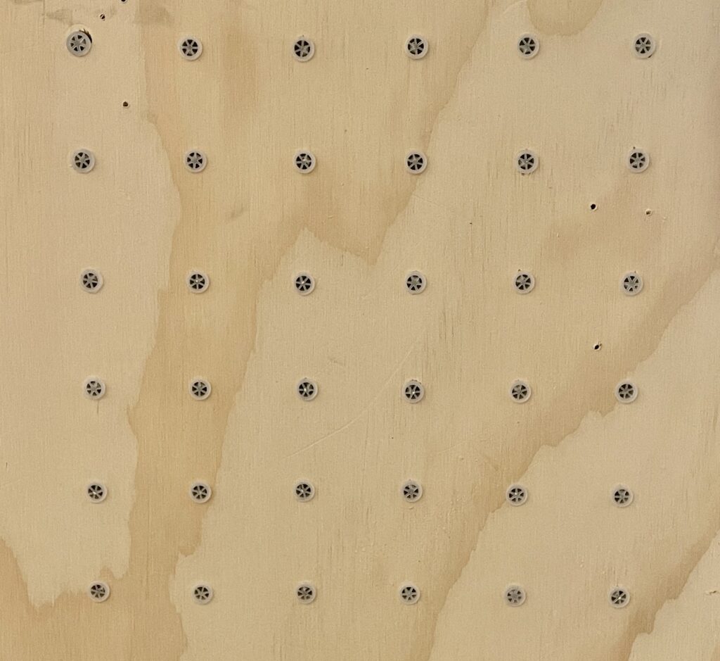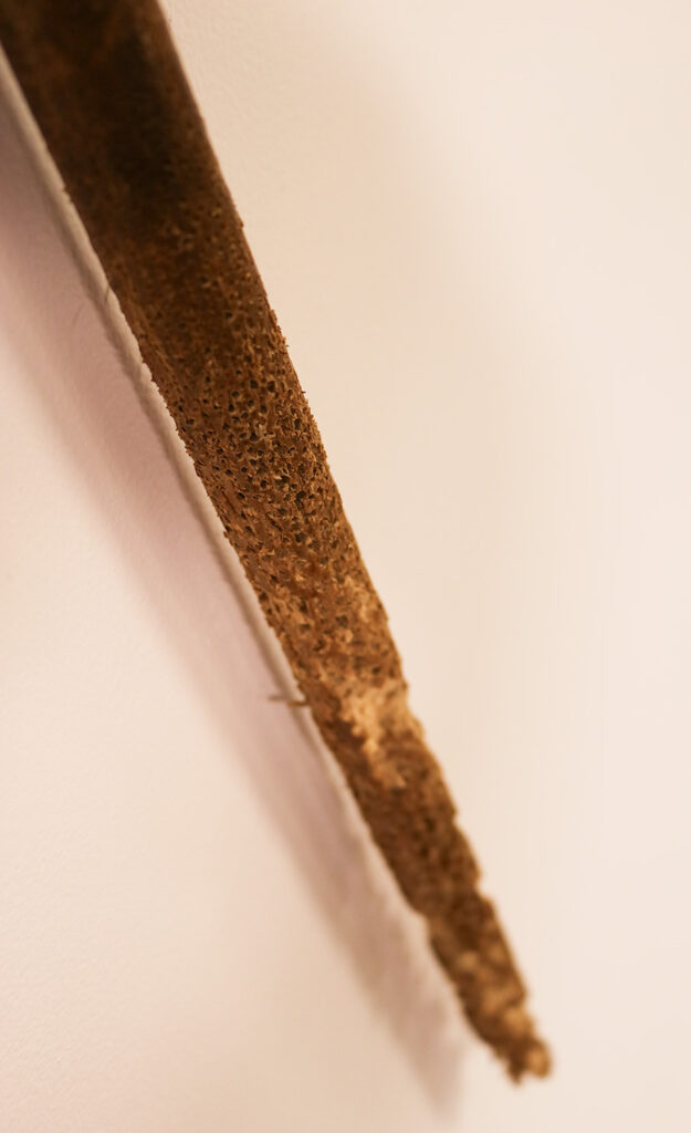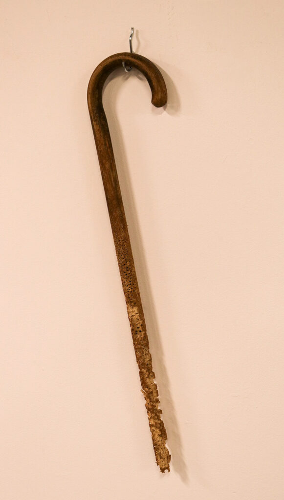 Wooden walking cane with circular punctures ranging in size and depth creating a gradient effect. Drilled holes increase in size until the cane’s shaft is broken