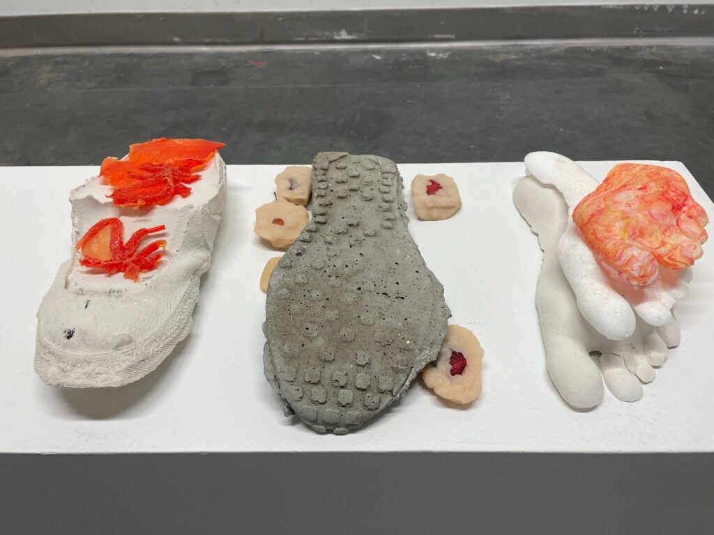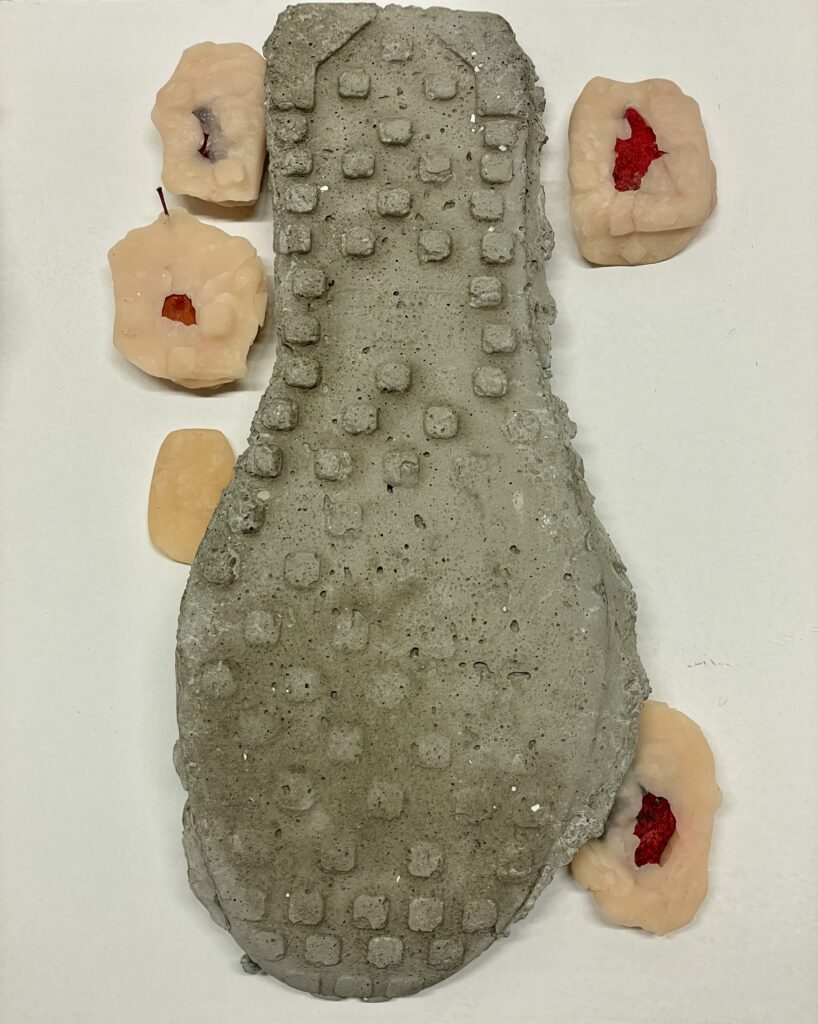 - Concrete, plastic, plaster, polymer clay, found rocks, crabapple