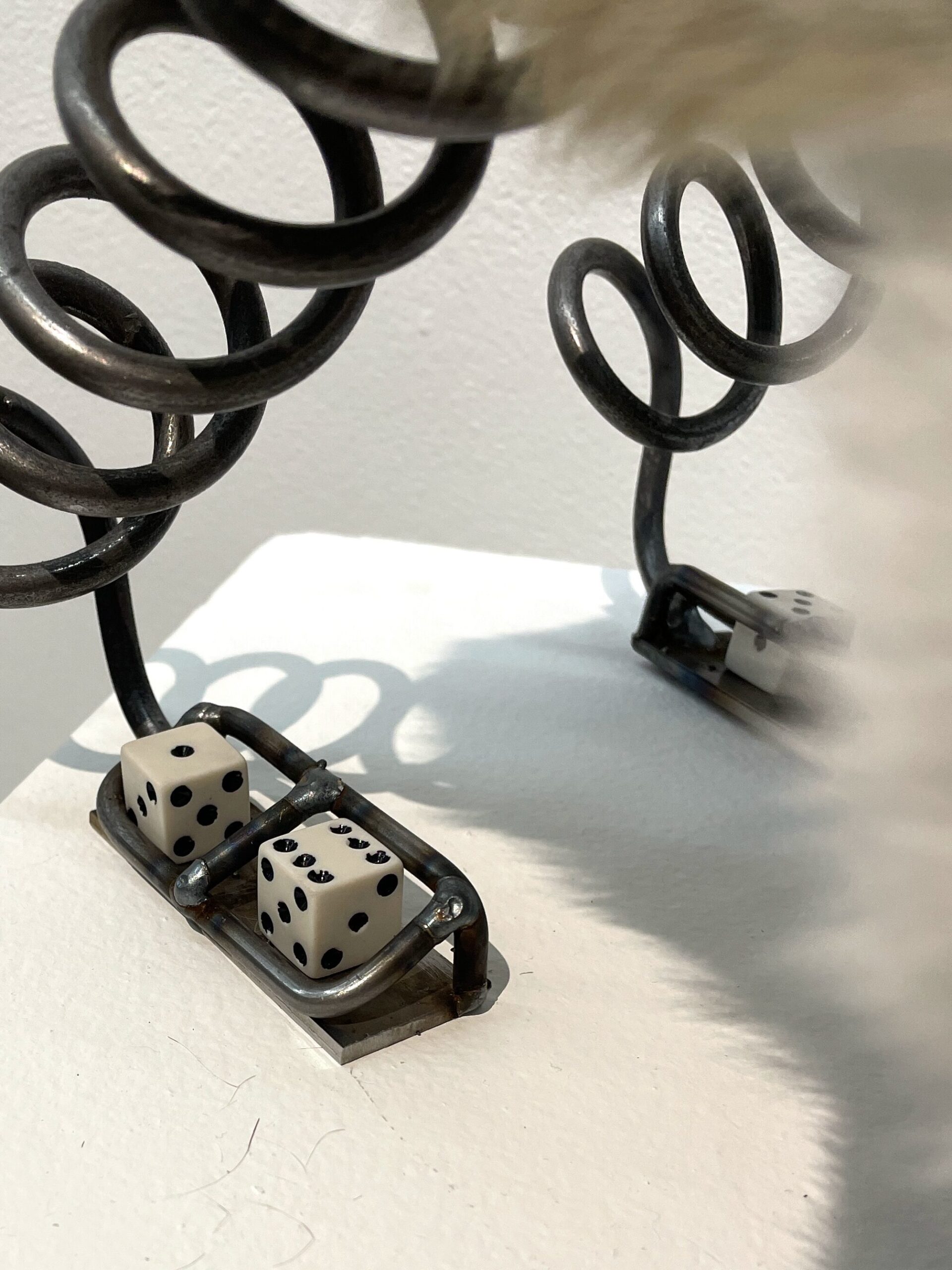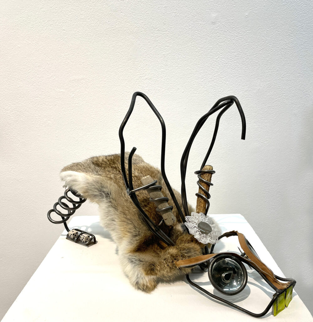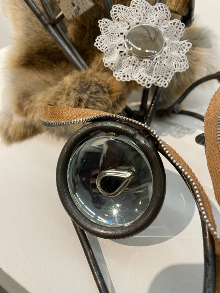 - Metal, rabbit pelt, price tag, dice, antler, magnifying glass lenses, cabinet knob, master lock backing, earrings, zipper, parking token, plastic, reflective snap wristband
